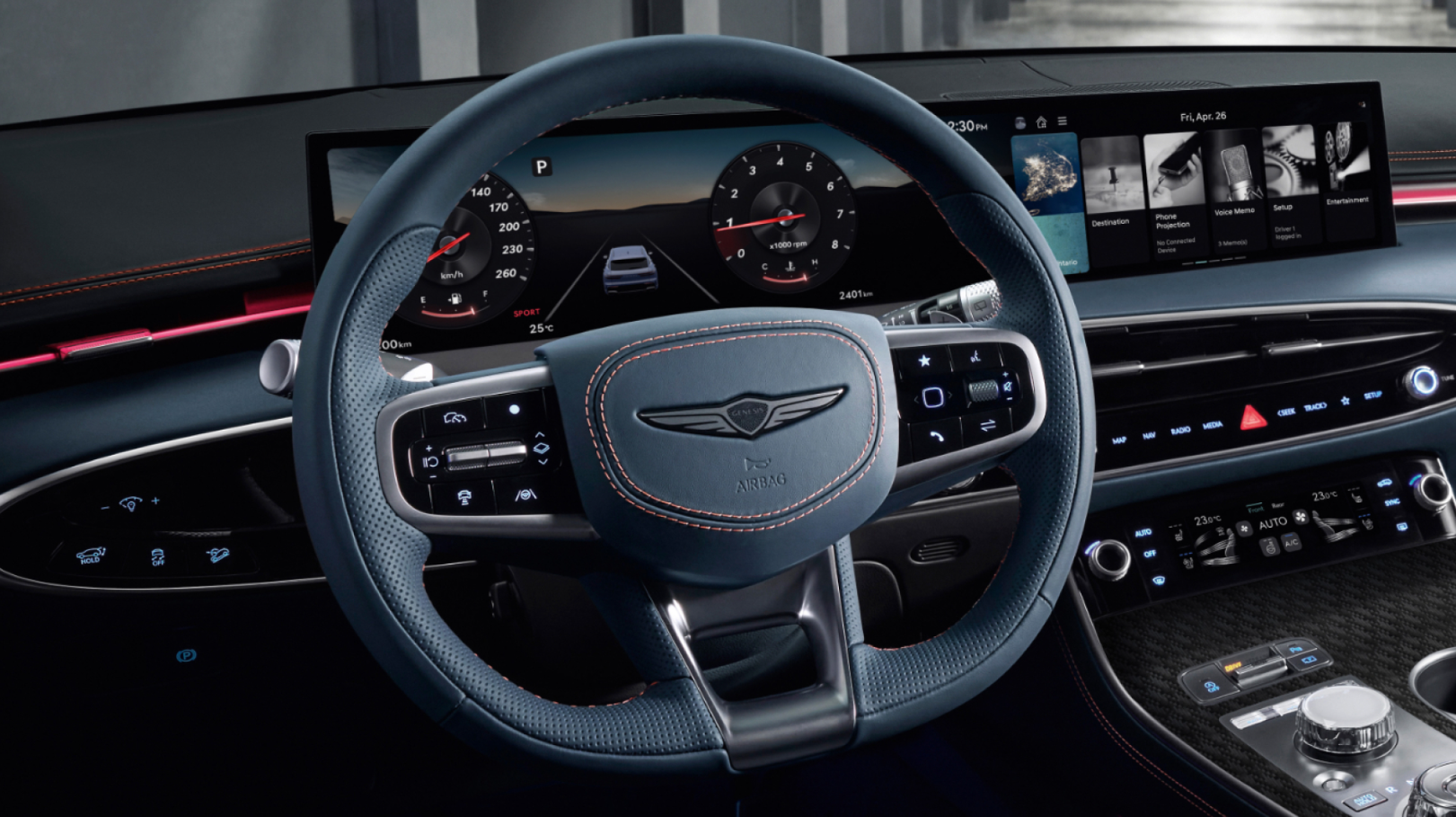 The moment the door closes, the GV70 draws you into something quieter, more intentional. Every line, every texture, every touchpoint has been considered. Nappa leather seats welcome you with rich quilting and ergonomic support, crafted to feel tailored rather than standard. The new steering wheel, finished in two-tone with refined stitching and a sculpted Genesis emblem, blends form and function with ease.