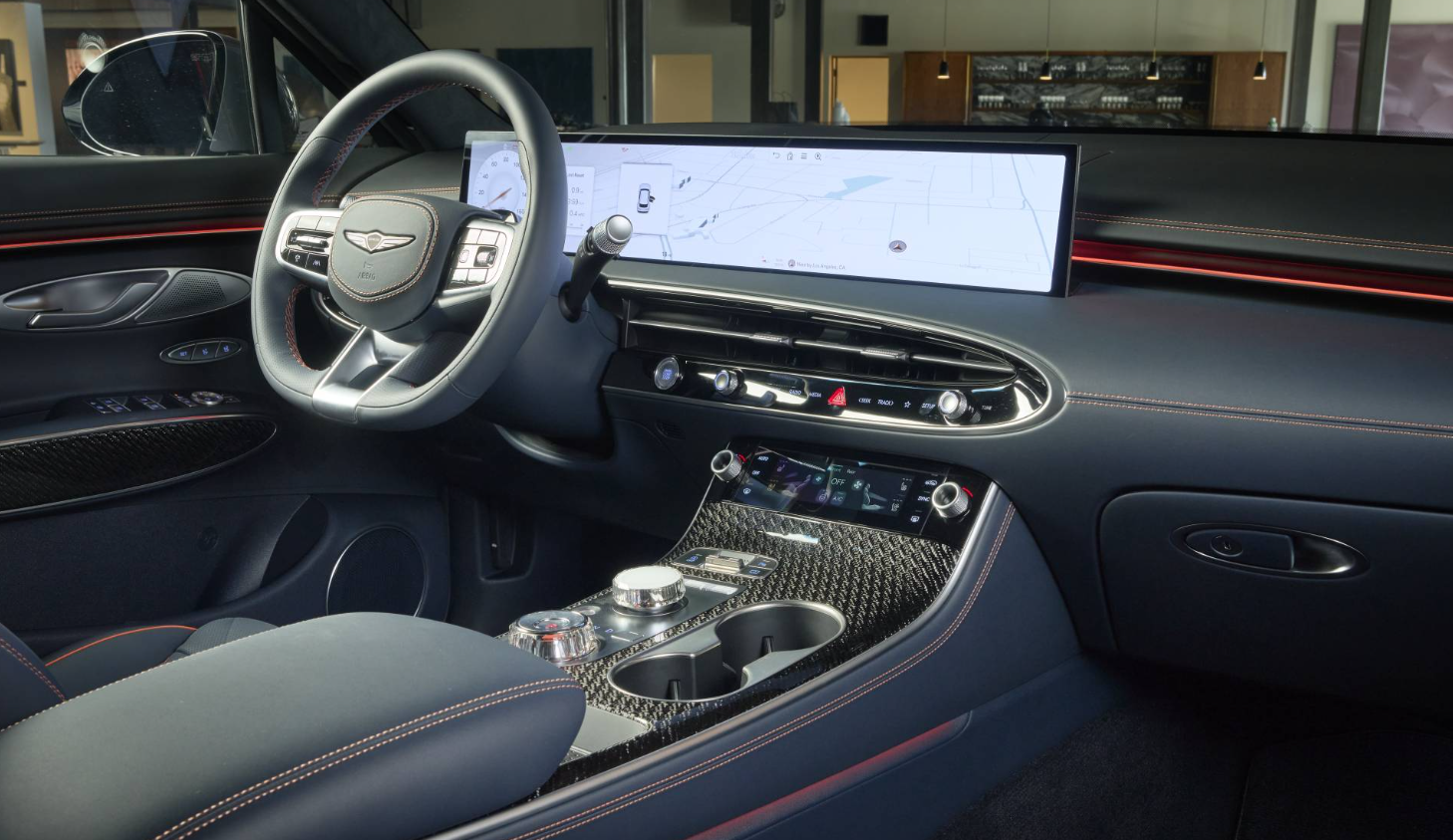 A 27-inch OLED display sweeps across the dash in a single pane of high-definition clarity, merging the digital cluster with navigation and infotainment controls. It anchors a space designed for focus, not distraction. Beneath it, slim chrome-trimmed vents and a jewel-like rotary dial sit within a console that is clean, modern, and deliberately arranged.